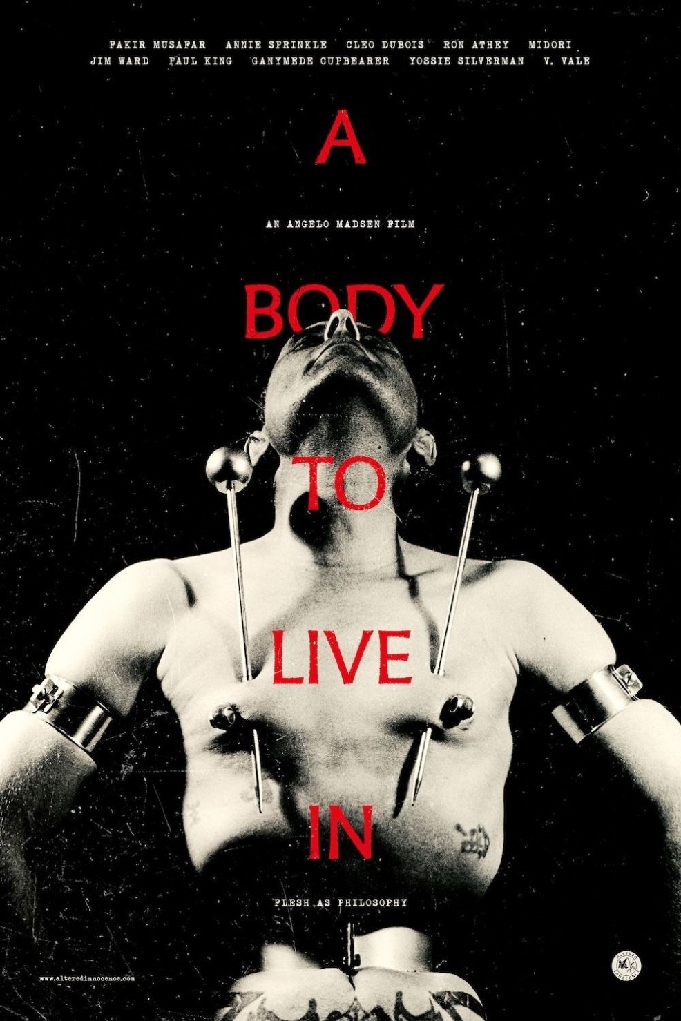 Blending rare archival footage with the voices of queer and artistic trailblazers, the film shows how pain, ritual, and transformation became tools of identity, survival, and self-expression. Weaving from early experiments and secret gatherings to the emergence of a global subculture shaped by the AIDS crisis and spiritual reinvention, director Angelo Madsen (NORTH BY CURRENT) reveals not just the story of one artist, but a collective history of bodies in revolt - asking what it truly means to live freely in one's own skin. A BODY TO LIVE IN includes rare audio recordings of Musafar himself, and reflections from numerous influential cultural figures and artists including Annie Sprinkle, Ron Athey, V. Vale, Midori, Cléo Dubois, Sheree Rose, Stanya Kahn, Mark Thompson, Divinity P. Fudge, Julie Tolentino, James Stone, and Vaginal Davis.