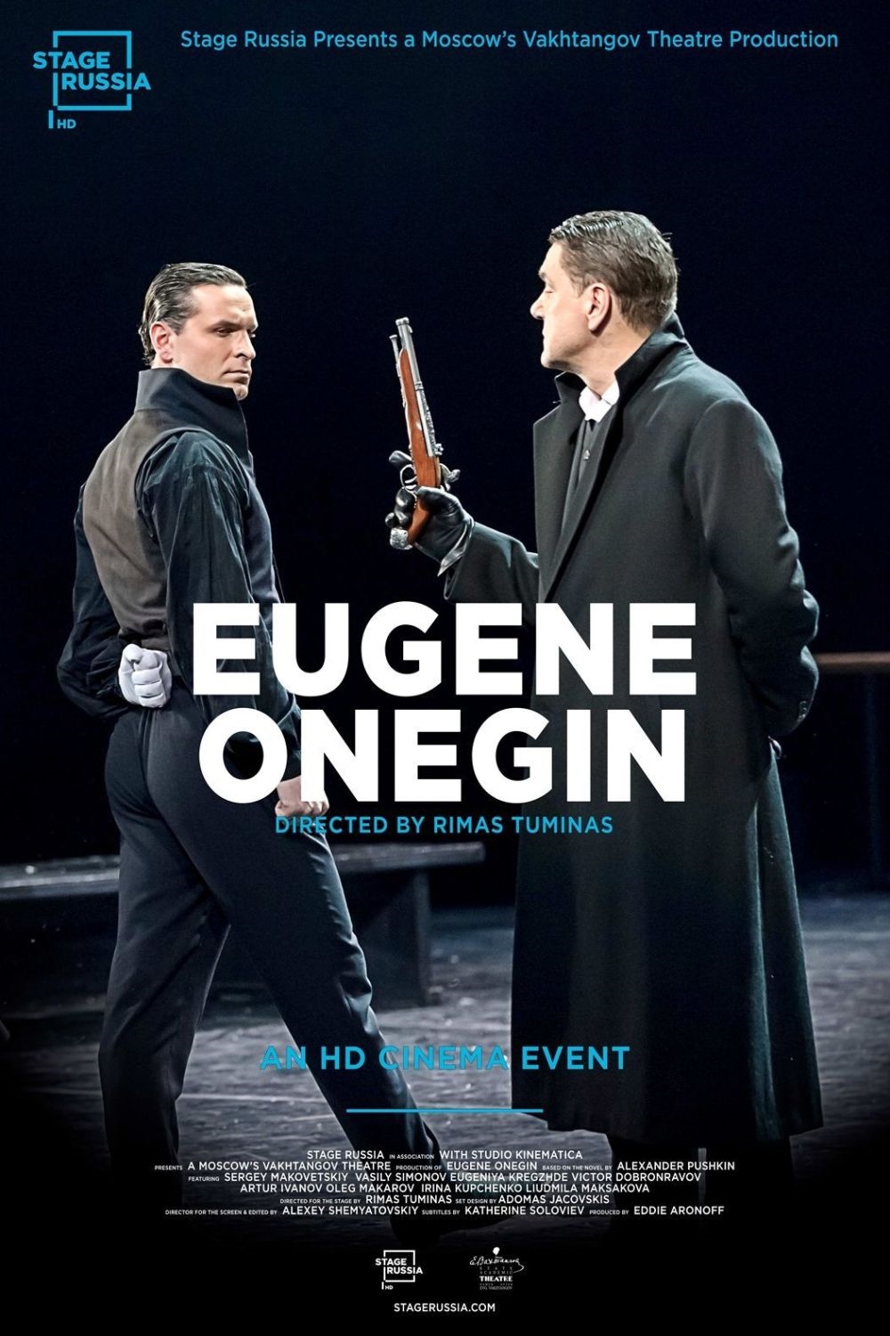 Rimas Tuminas' extraordinary Eugene Onegin unfolds in the memory and imagination of Pushkin's characters. The images are split between past and present, between reality and imagination.The scale of the production constantly shifts from noisy celebrations to secluded contemplation, from crowd scenes to lonely recollections, all of which are drawn together from the past just like the fragments of Tatyana's love letter, framed and hung on the wall, looming next to and above Onegin's arm-chair. Filmed before a live audience from Moscow's Vakhtangov Theatre. (Russian with English subtitles)